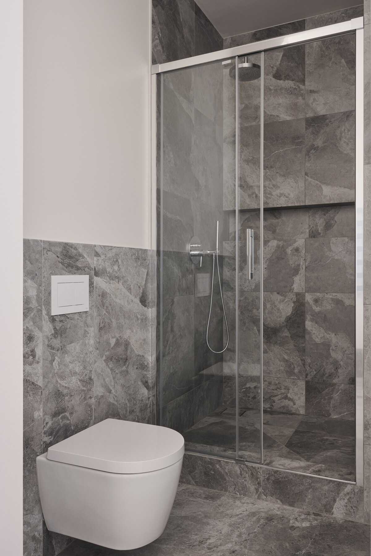 В ванной душевая кабина, полотенцесушитель, стиральная машина